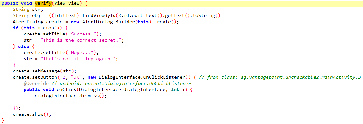 どうやら、「this.m.a(obj)」の返り値の真偽によって入力した文字列がsecret stringであるかどうかを判定しているようです。