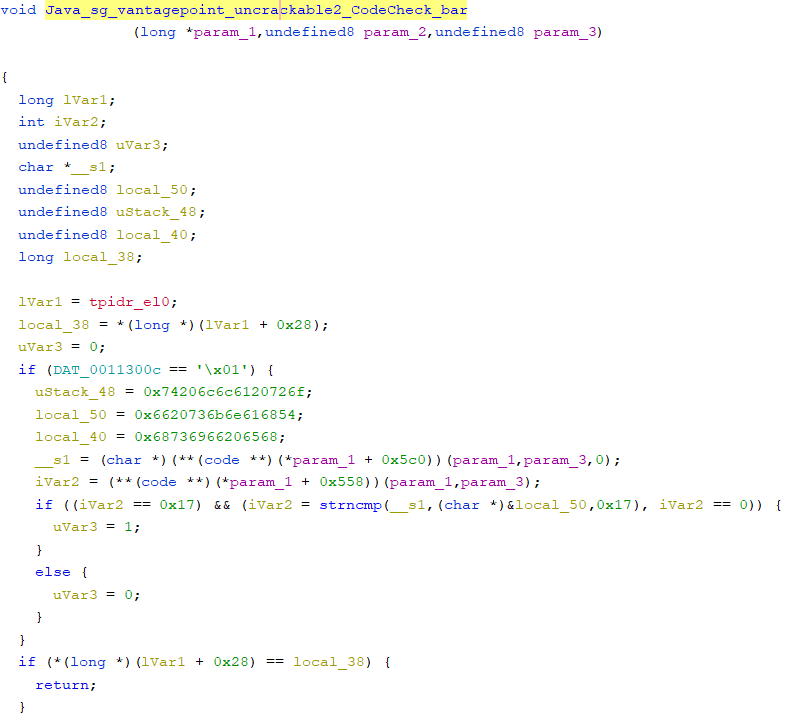 Ghidraで「libfoo.so」を開くと、「Java_sg_vantagepoint_uncrackable2_CodeCheck_bar」というシンボルの関数が見つかり、これが「bar」メソッドの正体だということが推測できます。