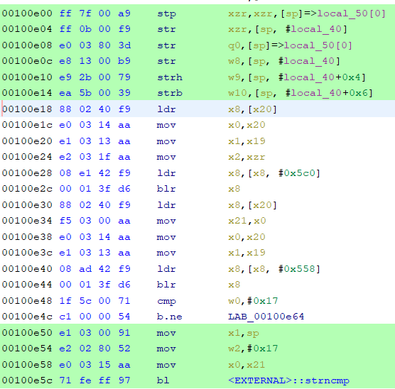 Ghidraの逆アセンブリされたコードを見てみると、「strncmp」でもともとx21レジスタに格納された文字列とスタックポインタに格納された文字列を比較しているということが分かります。